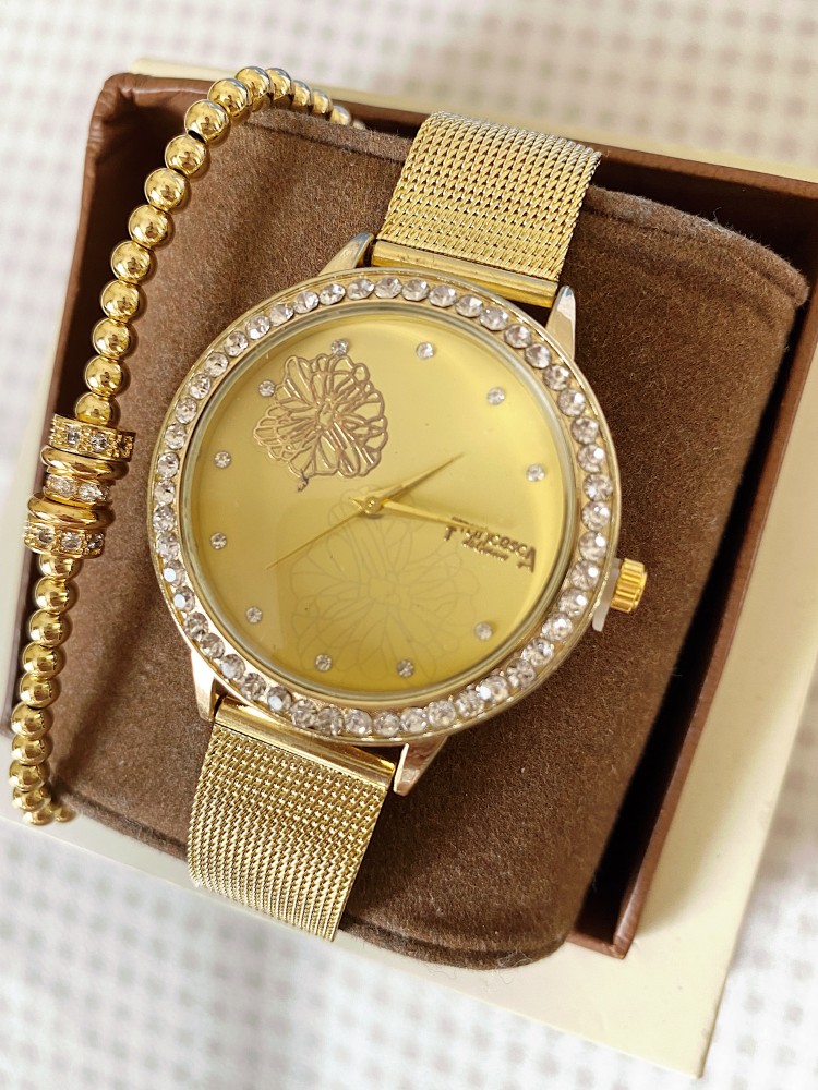 Ceas dama auriu cu bratara metalica si cadran cu frunza