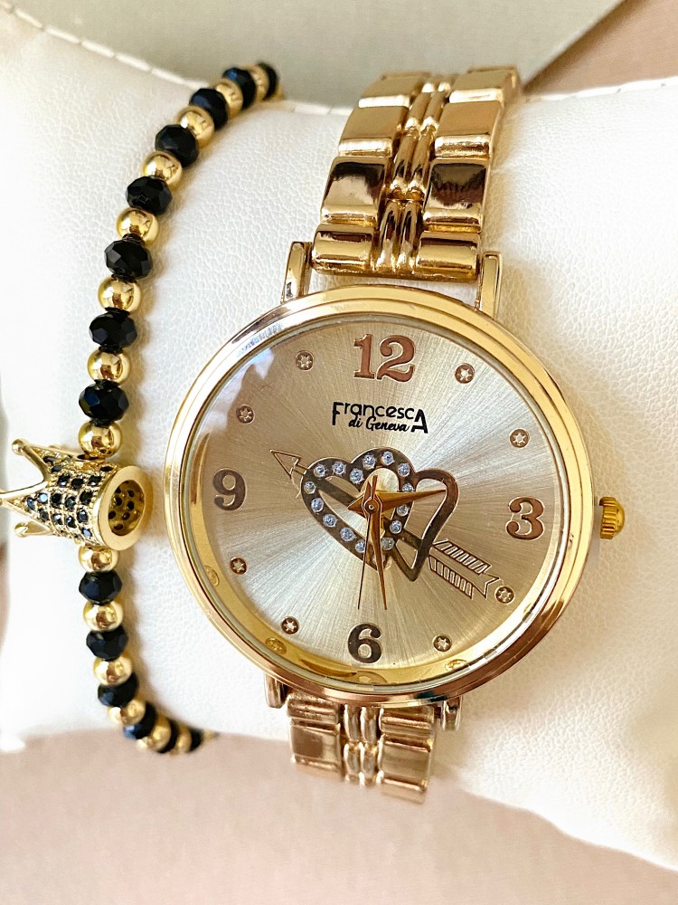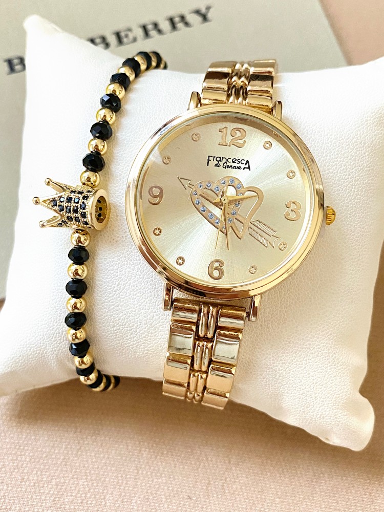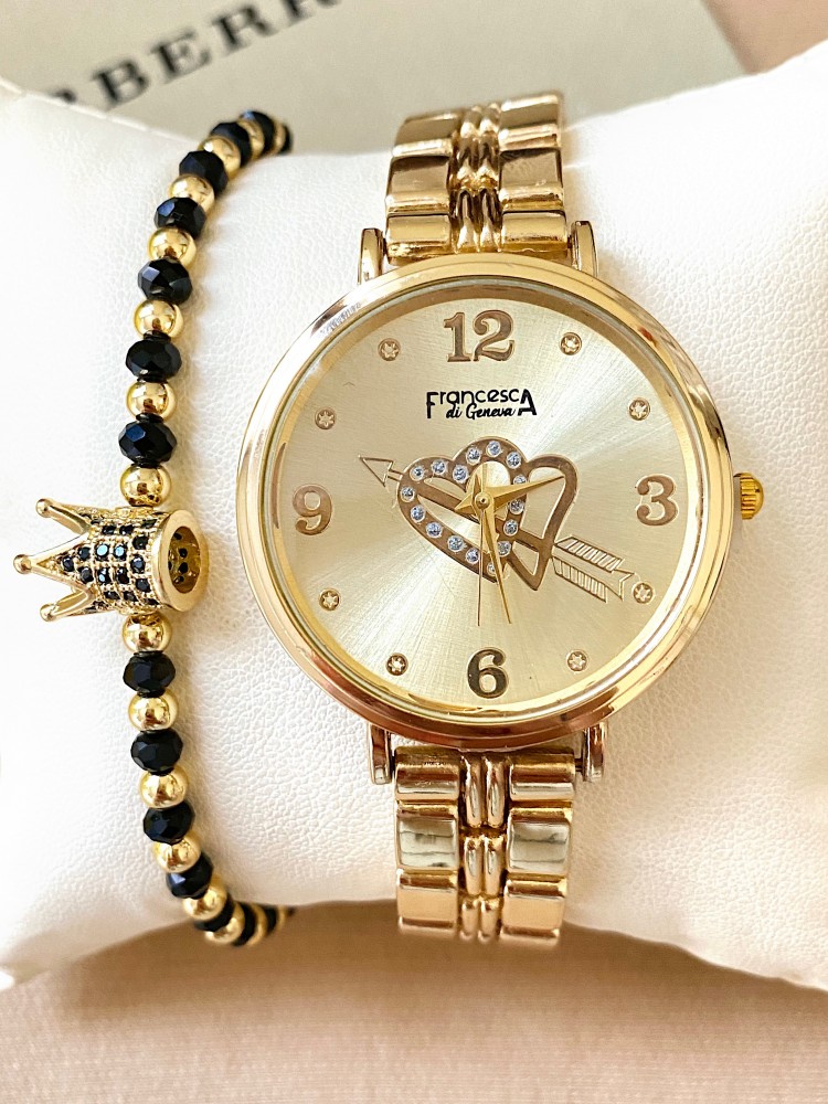 Ceas dama auriu cu bratara metalica si cadran cu inimioare