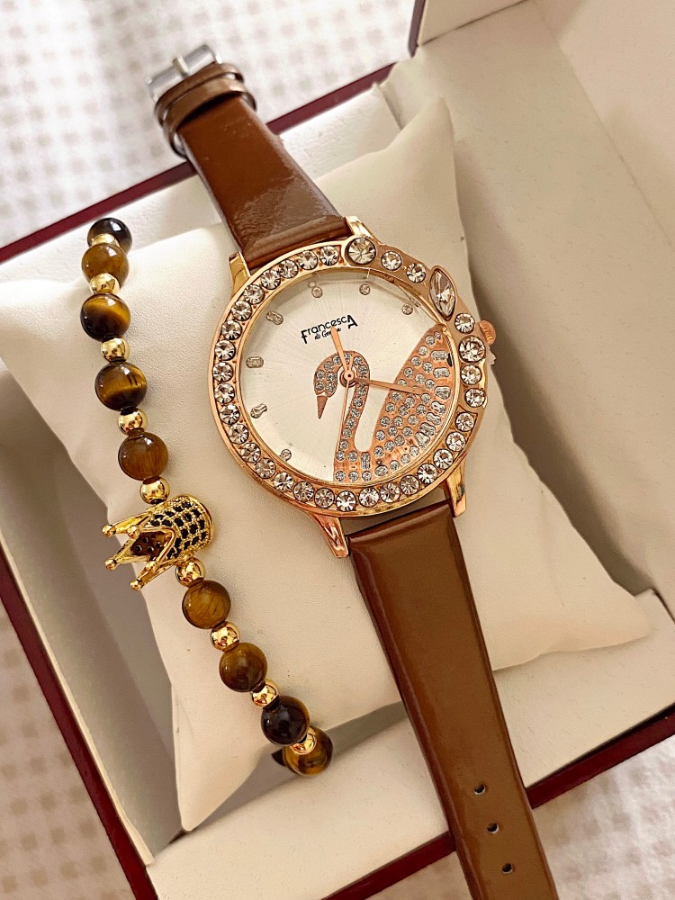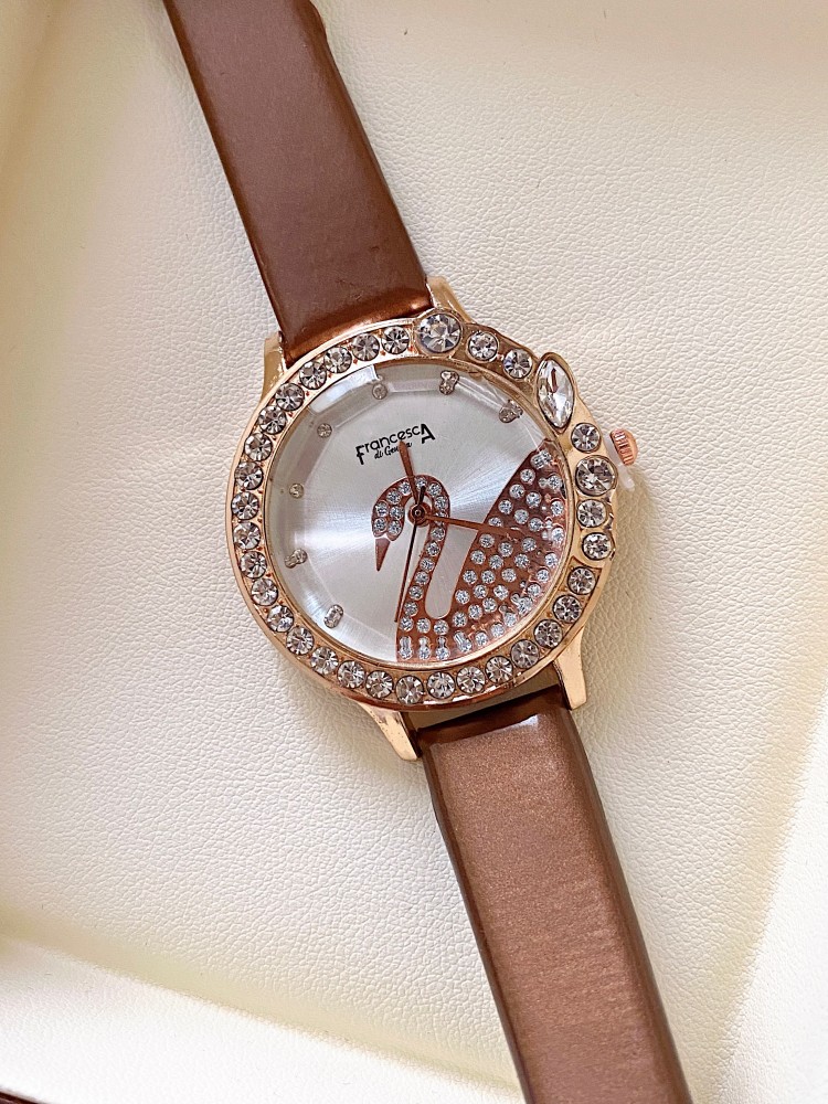 Ceas dama maro cu bratara din piele ecologica si cadran cu lebada
