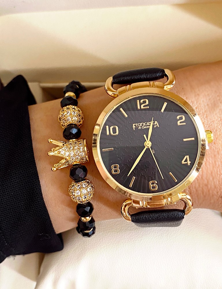 Ceas dama negru cu bratara din piele ecologica si cadran cu auriu