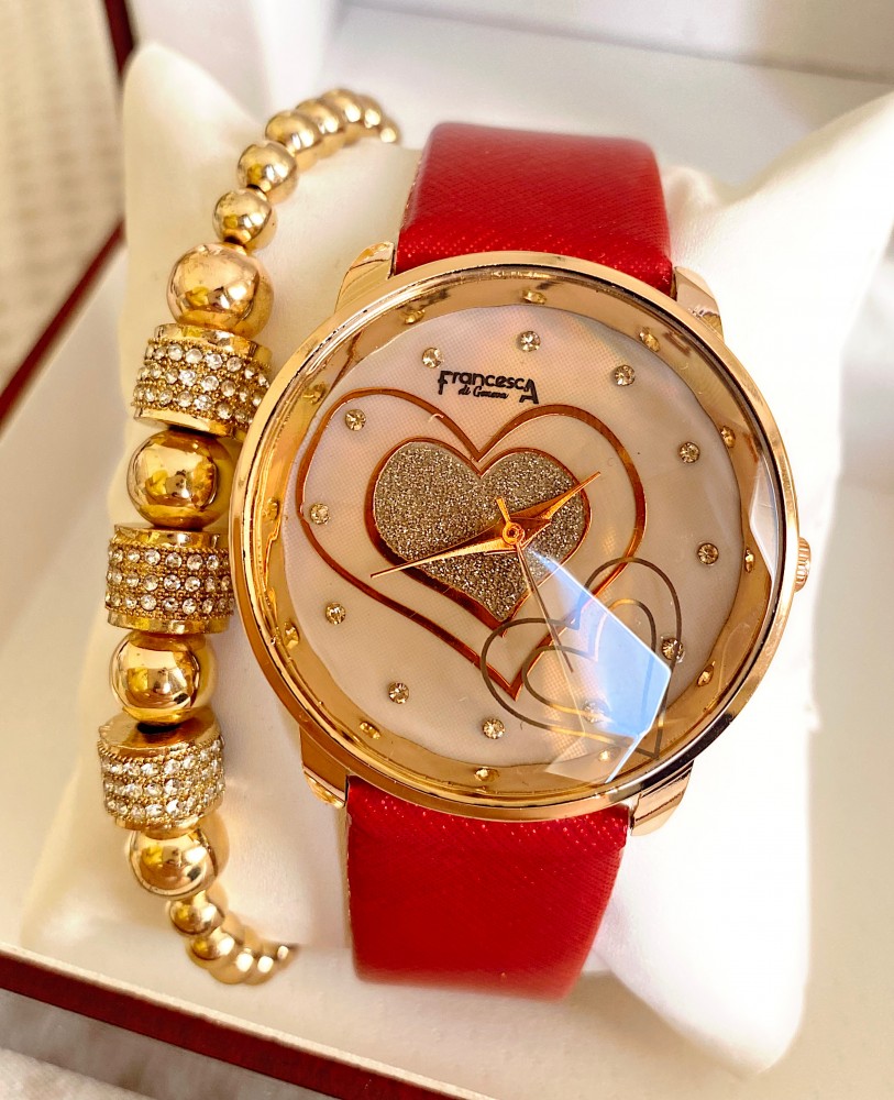 Ceas dama rosu cu bratara din piele ecologica si cadran cu inima