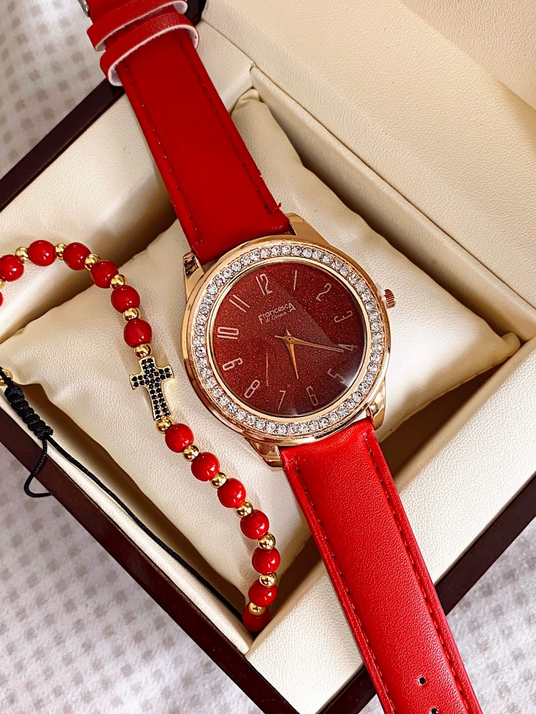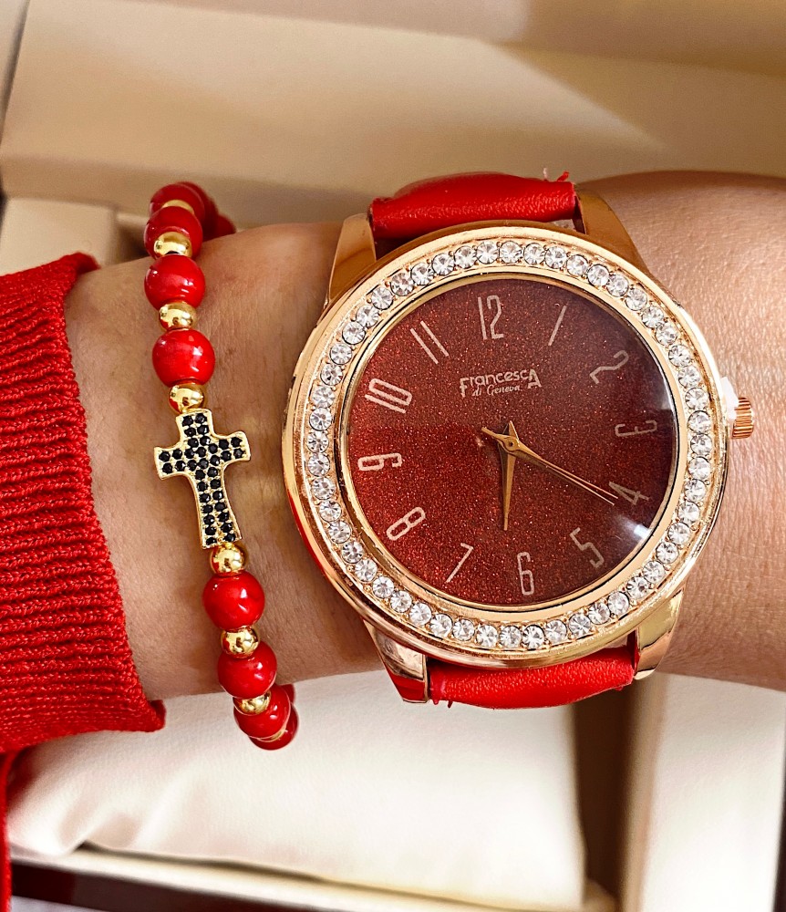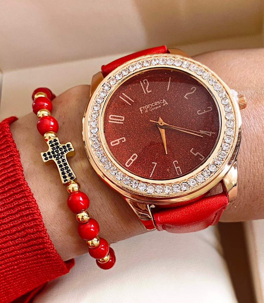 Ceas dama rosu cu bratara din piele ecologica si cadran cu pietricele