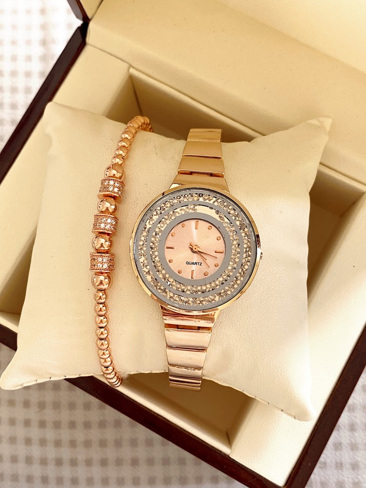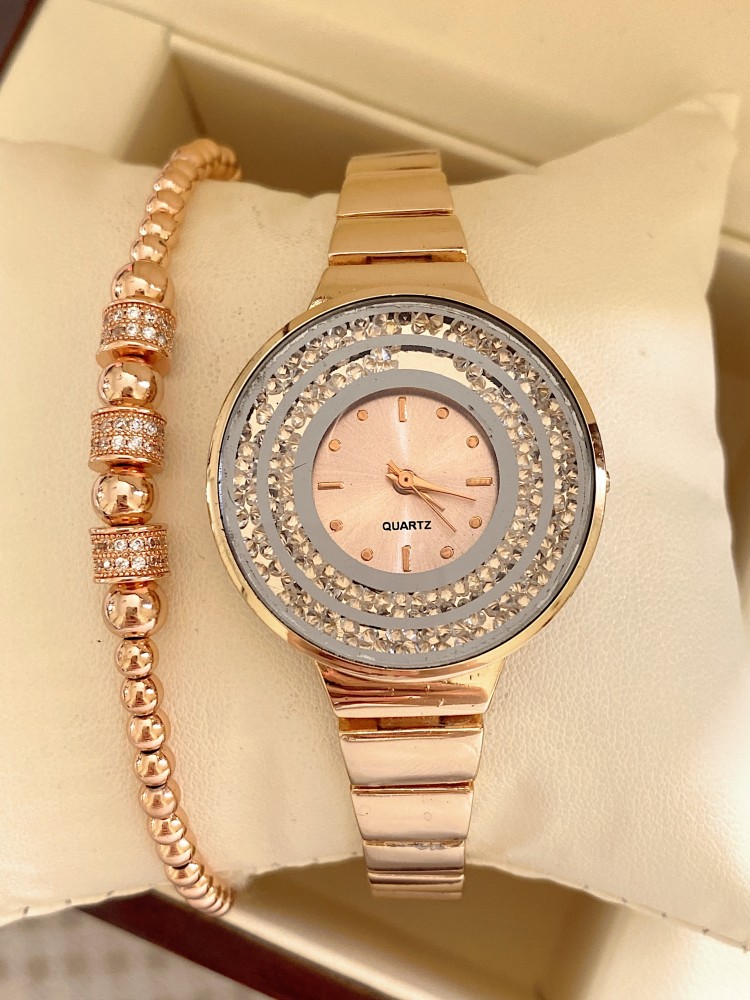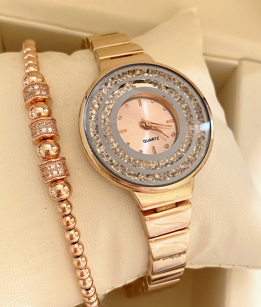 Ceas dama roze cu bratara metalica si cadran cu multe straturi pietricele