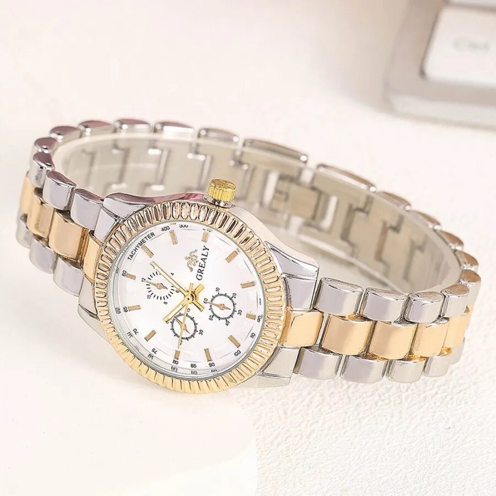 Acest ceas dama auriu cu argintiu cu curea metalică din oțel este o bijuterie funcțională ce emană eleganță și rafinament.