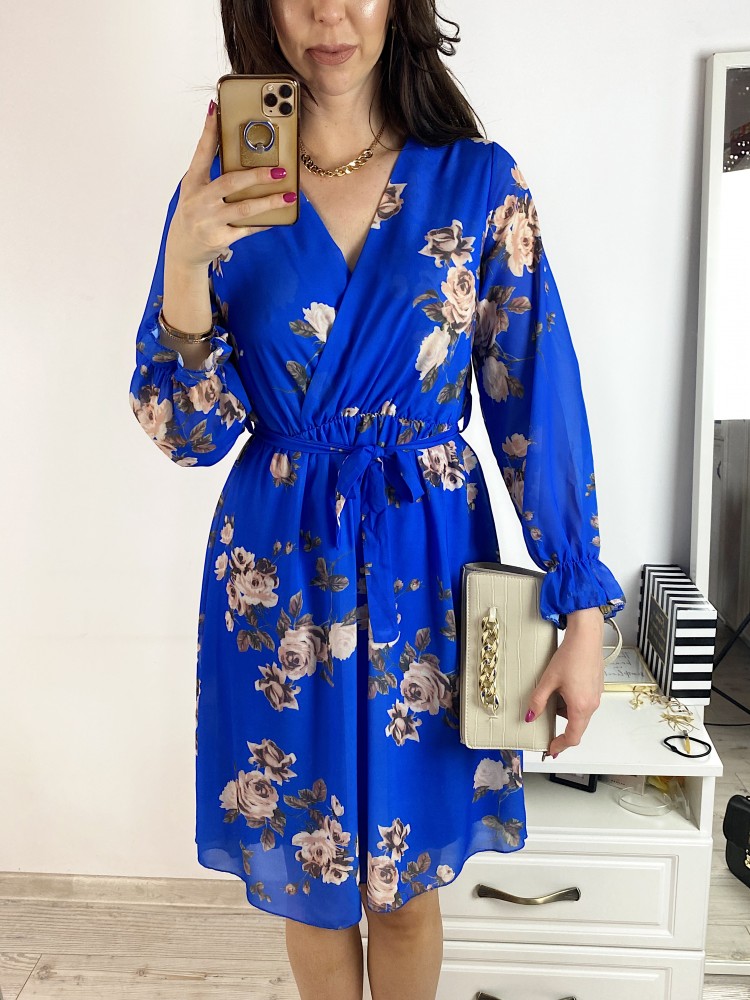Rochie dama eleganta midi albastra cu pliuri si imprimeu floral boem