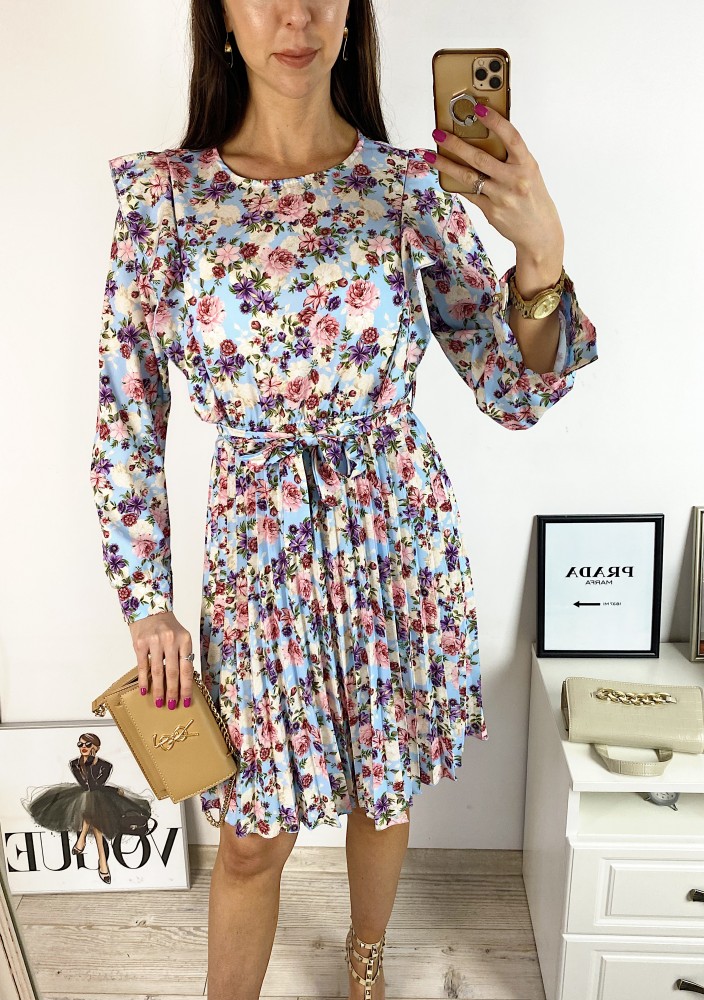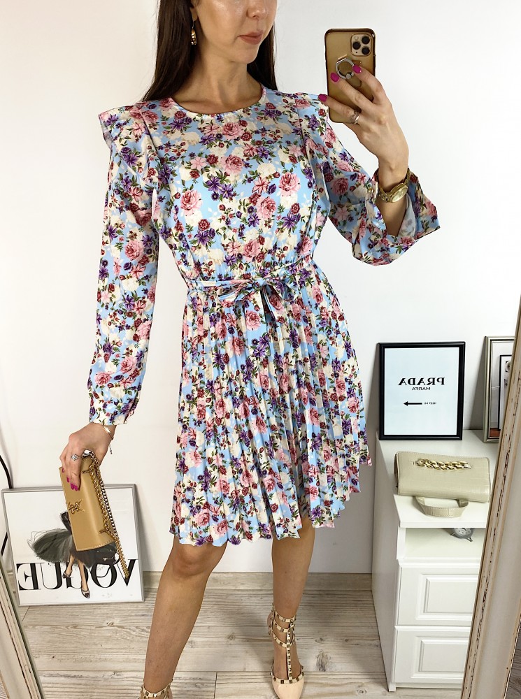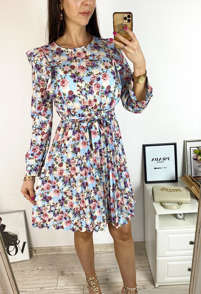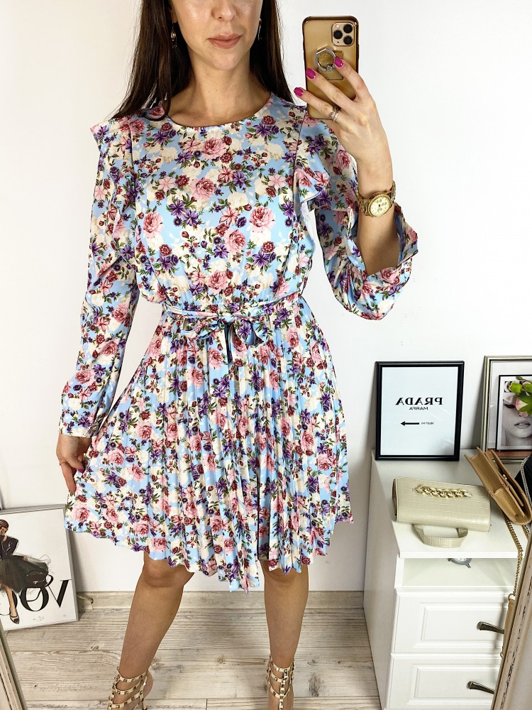 Rochie dama ieftina albastra midi cu pliuri si volanase si imprimeu multifloral