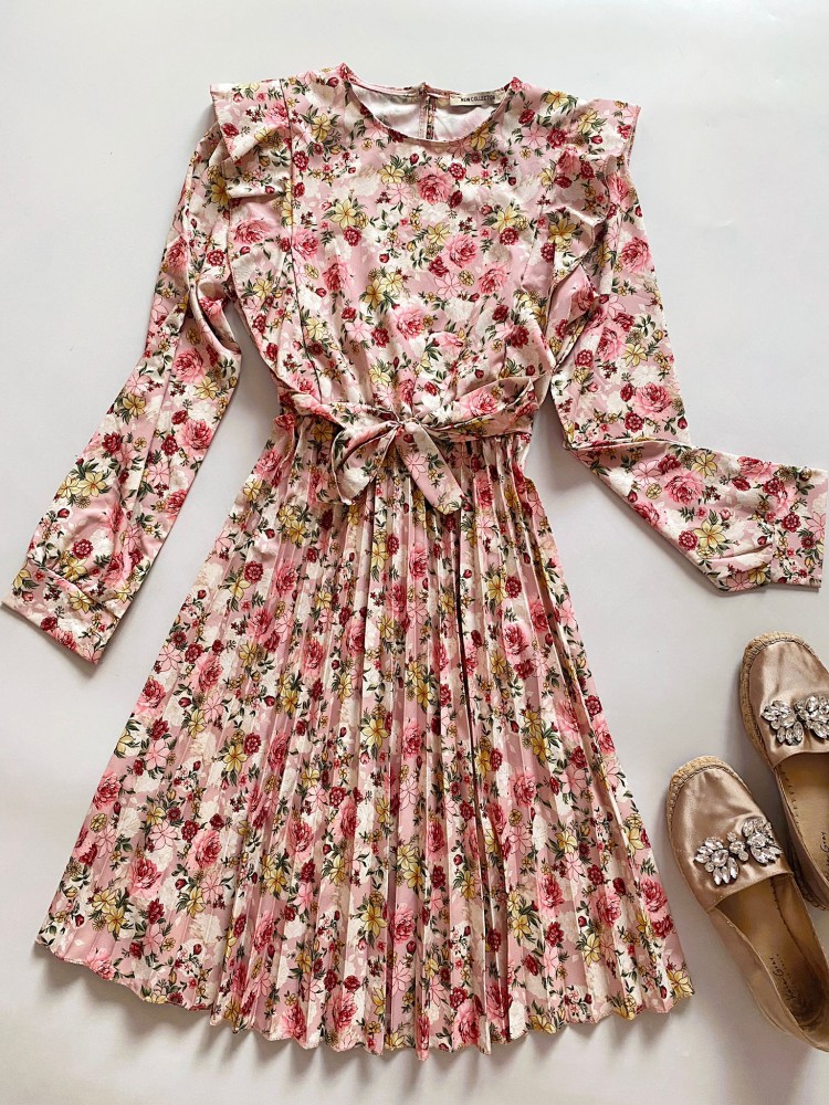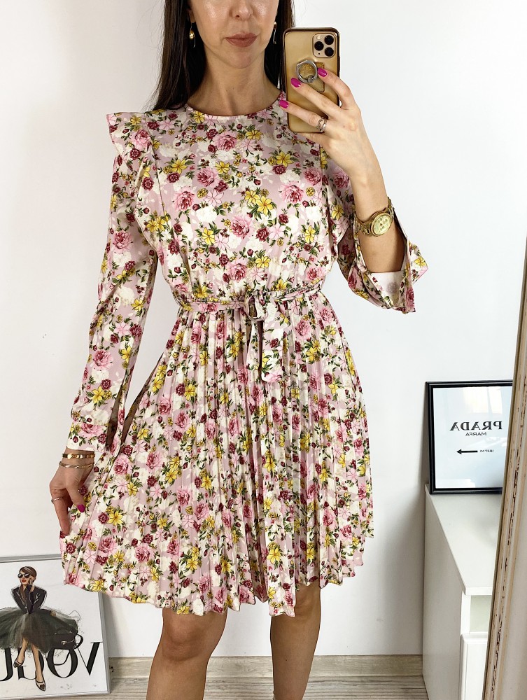 Rochie dama ieftina crem midi cu pliuri si volanase si imprimeu multifloral