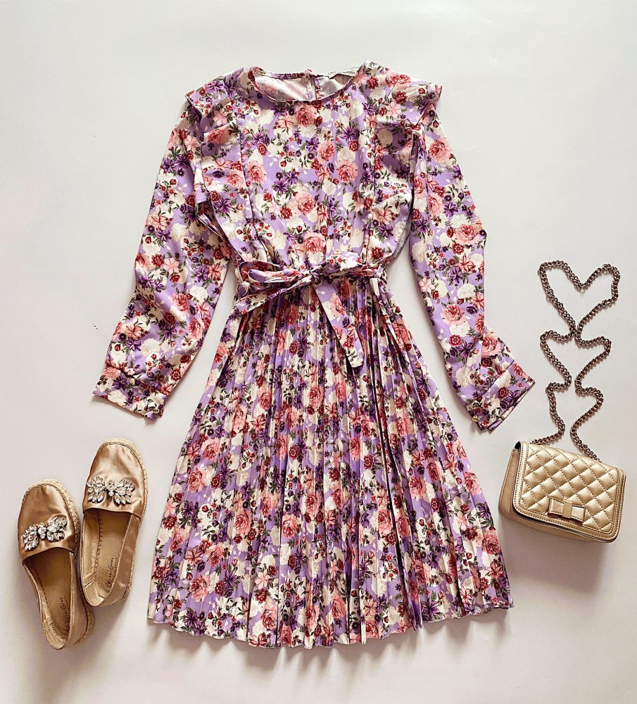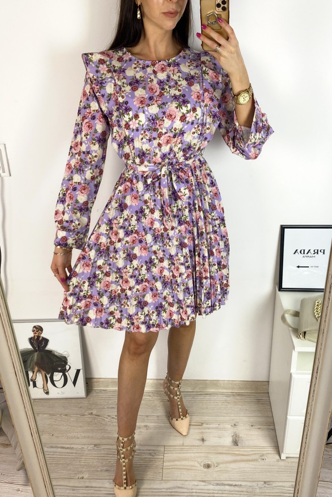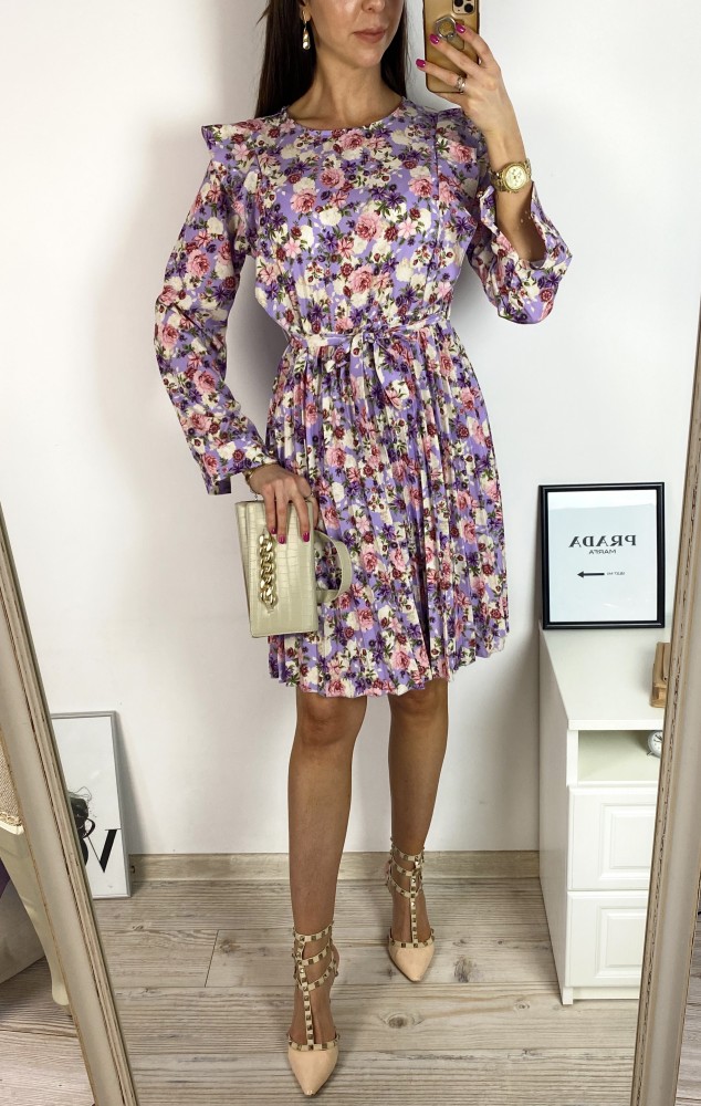 Rochie dama ieftina mov midi cu pliuri si volanase si imprimeu multifloral