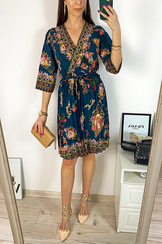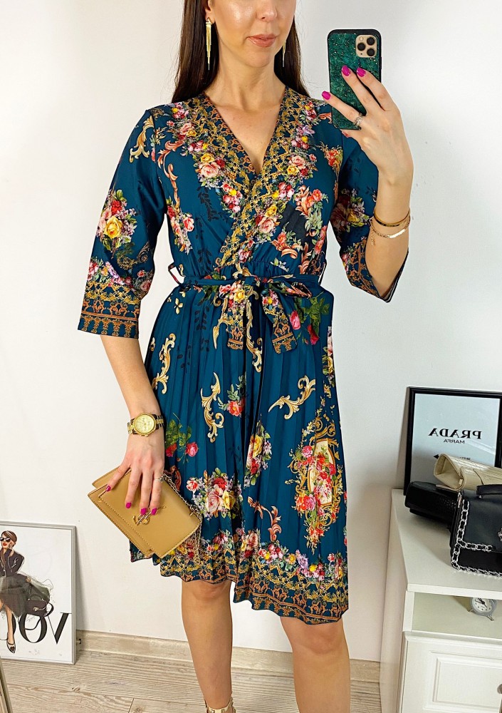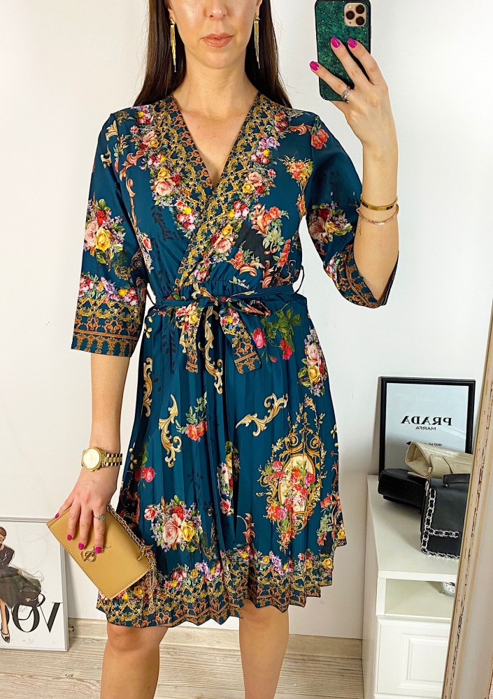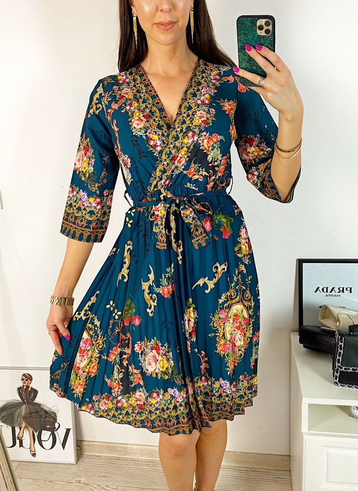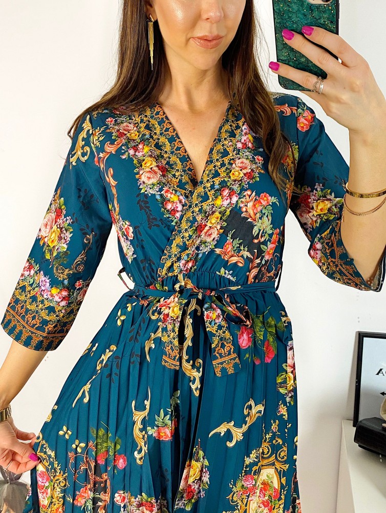 Rochie dama verde de zi midi cu pliuri si imprimeu flori vintage