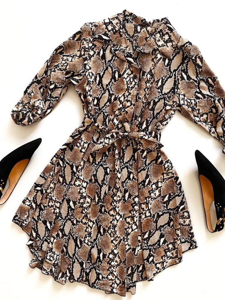 Rochie de zi ieftina maro stil camasa cu imprimeu snake print