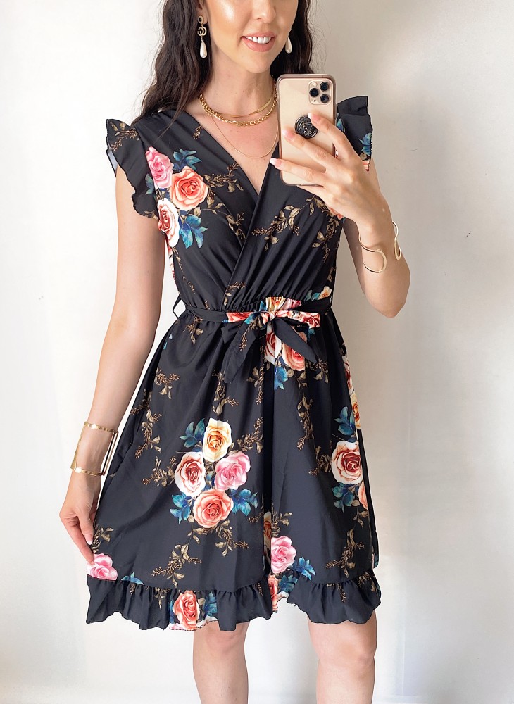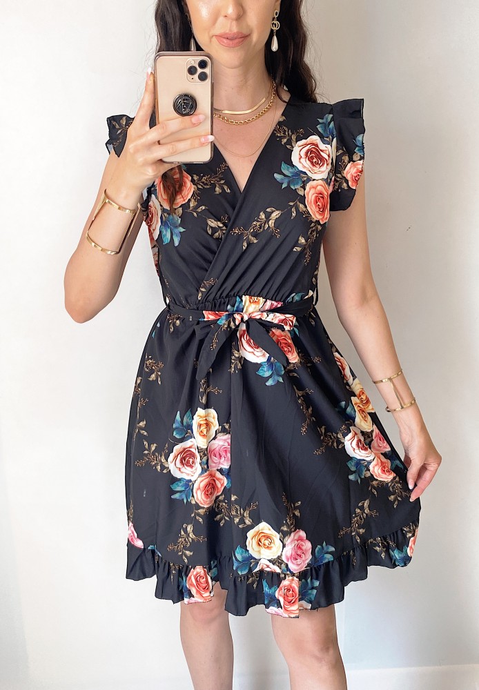 Rochie de zi scurta neagra cu flori si volanase la manecute