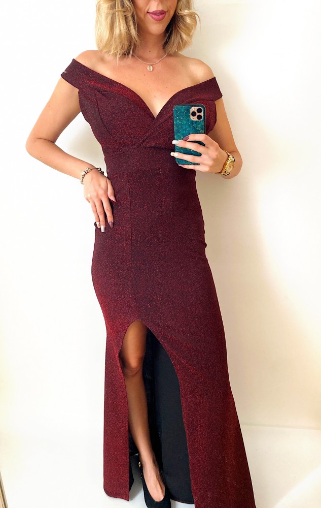 Rochie eleganta de ocazie visinie lunga cu decolteu adanc si sclipici