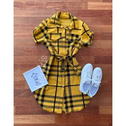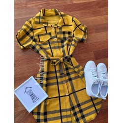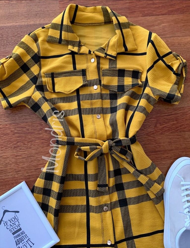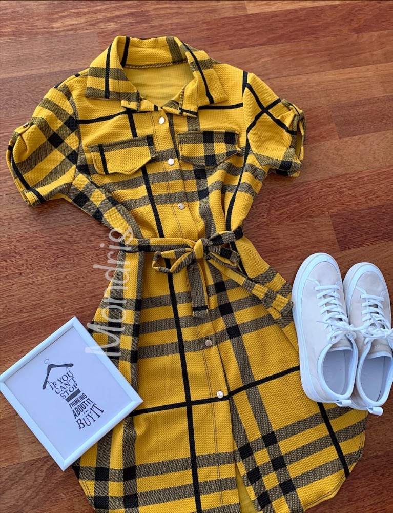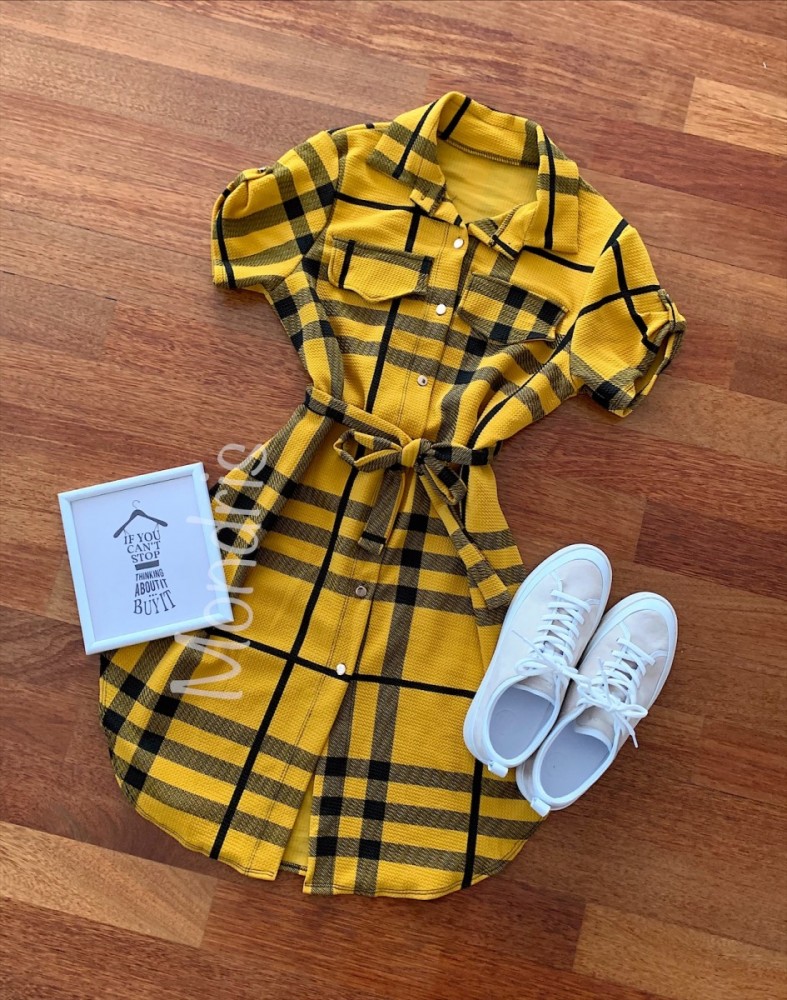 Rochie ieftina casual scurta stil camasa galbena si cordon in talie cu imprimeu dungi