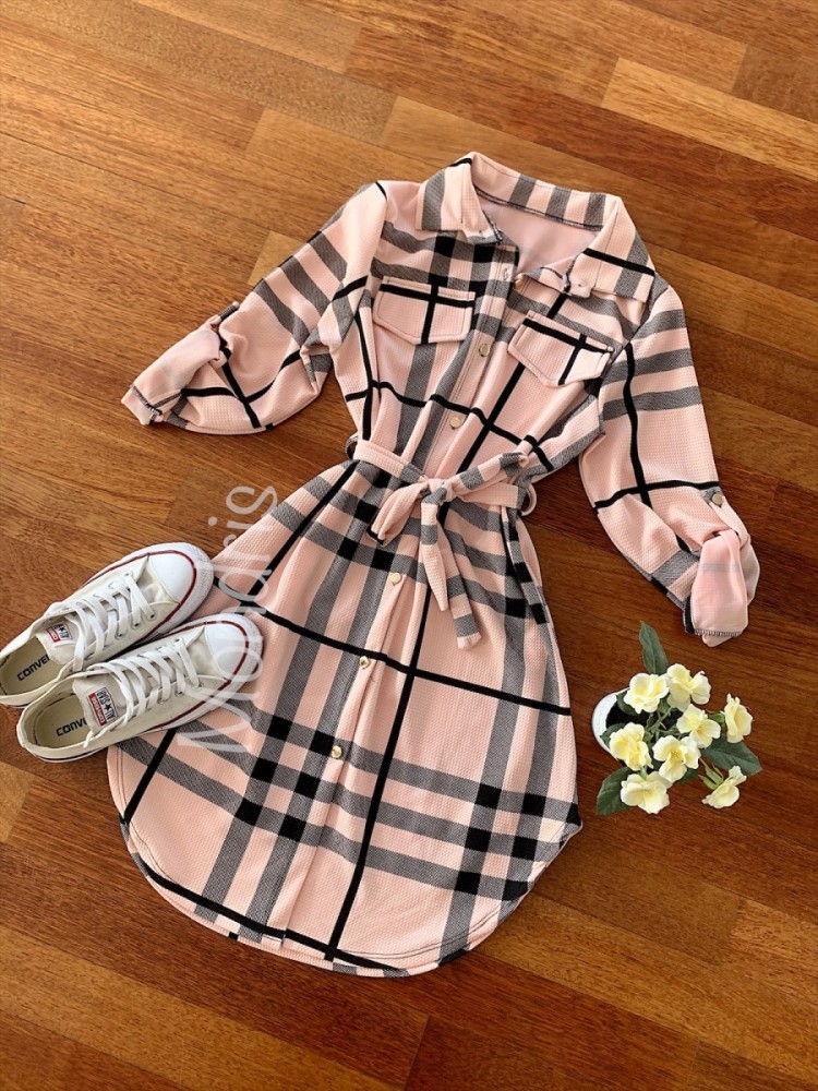 Rochie ieftina casual stil camasa lunga roz cu dungi si cordon in talie