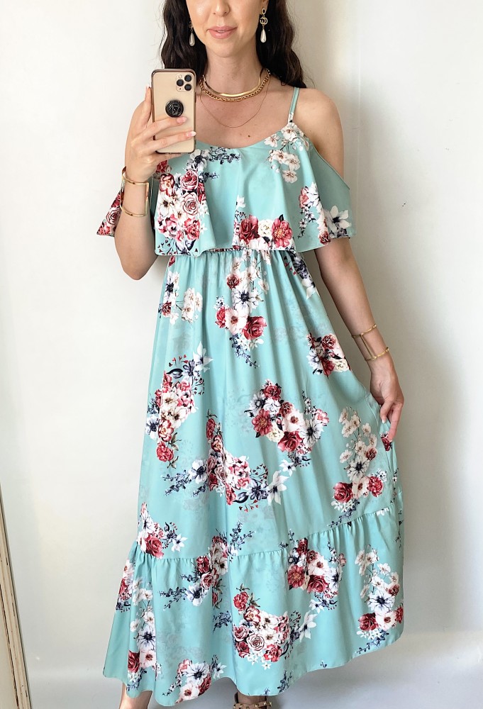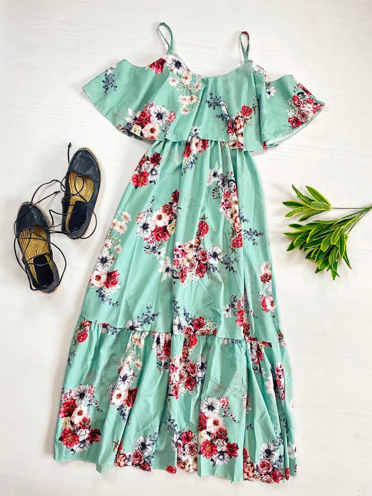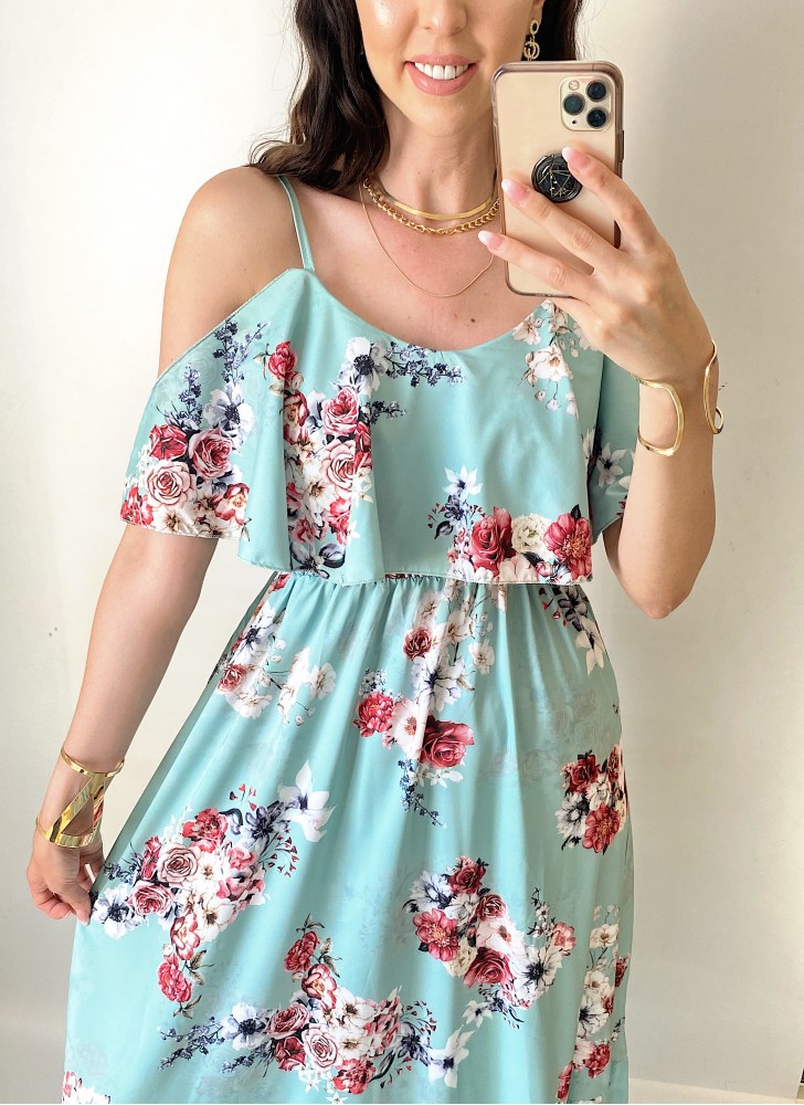Rochie midi casual ieftina verde cu imprimeu floral si maneci cazute pe umeri
