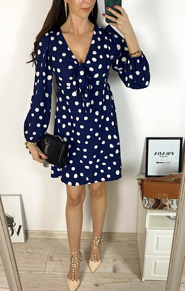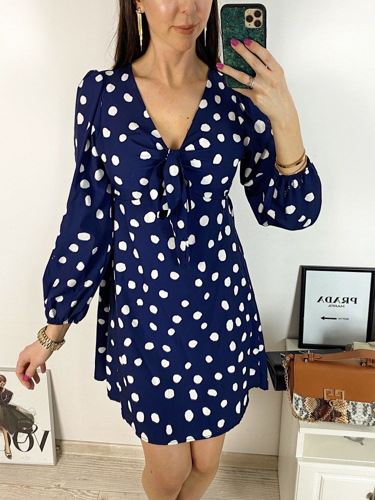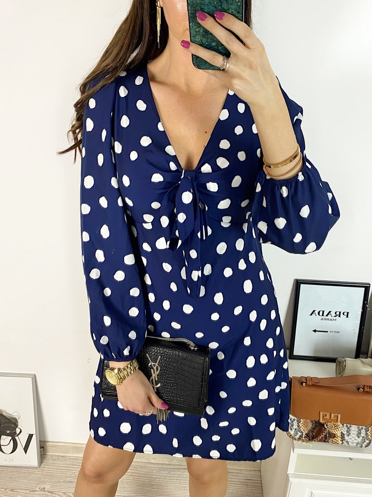 Rochie mini casual bleumarin cu imprimeu buline si maneci lungi