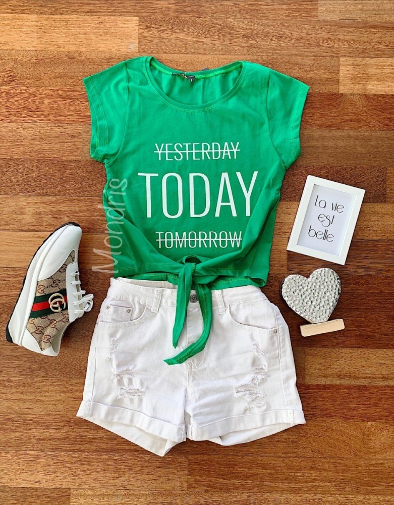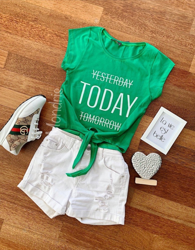 Tricou dama ieftin din bumbac verde cu snur in talie si imprimeu TODAY