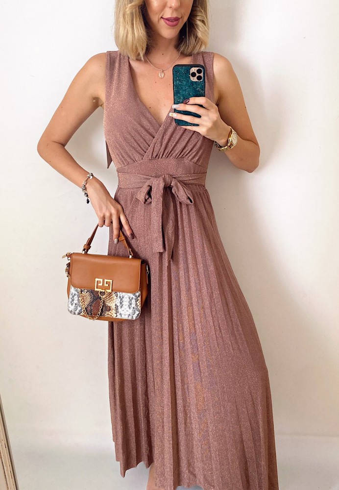 Rochie ieftina eleganta roz pal midi cu sclipici si cordon in talie