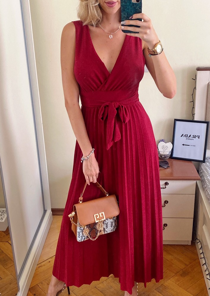Rochie ieftina eleganta scurta rosie midi cu sclipici si cordon in talie