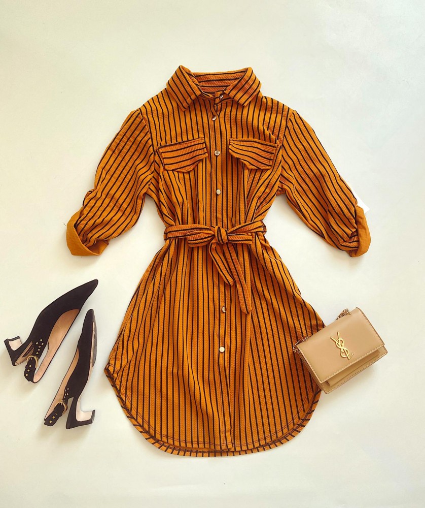 Rochie de zi ieftina galbena stil camasa cu imprimeu linii si cordon in talie