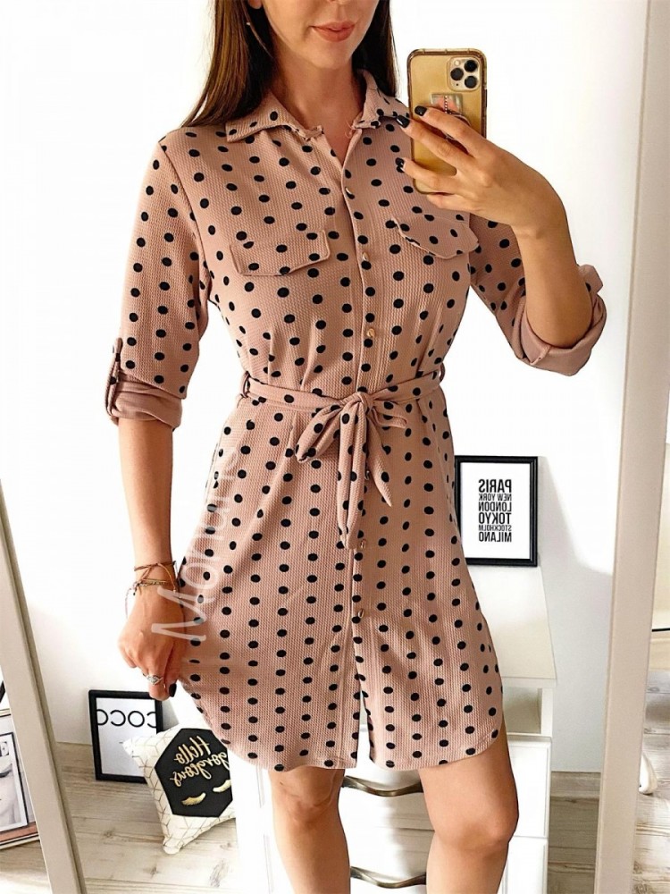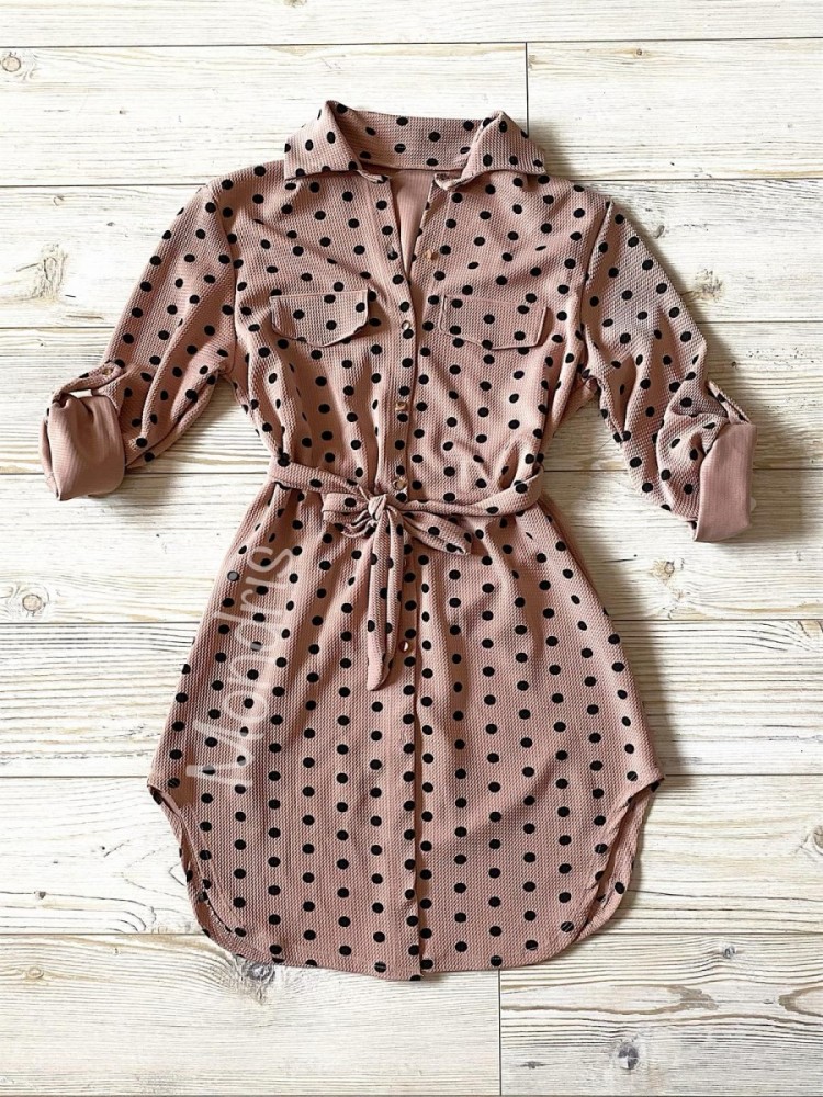 Rochie ieftina casual stil camasa roz cu puncte mari si cordon in talie