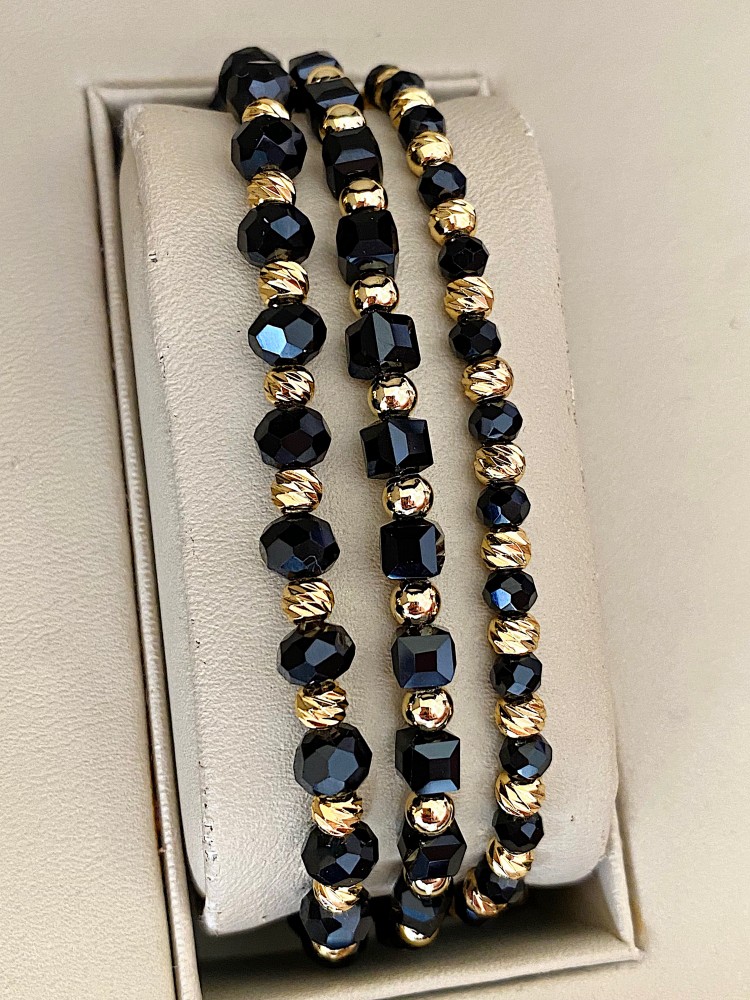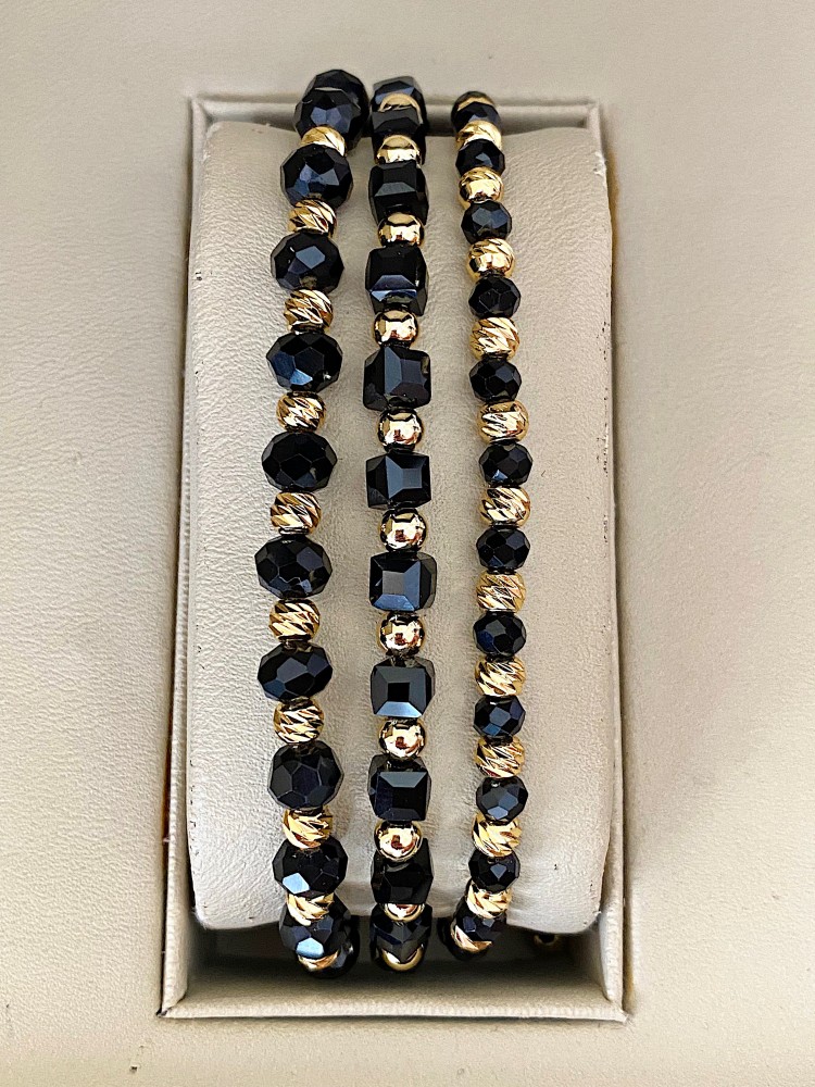 Etichete: Set 3 bratari unisex modele deosebite cu margele aurii si forme cu pietricele negre, ,