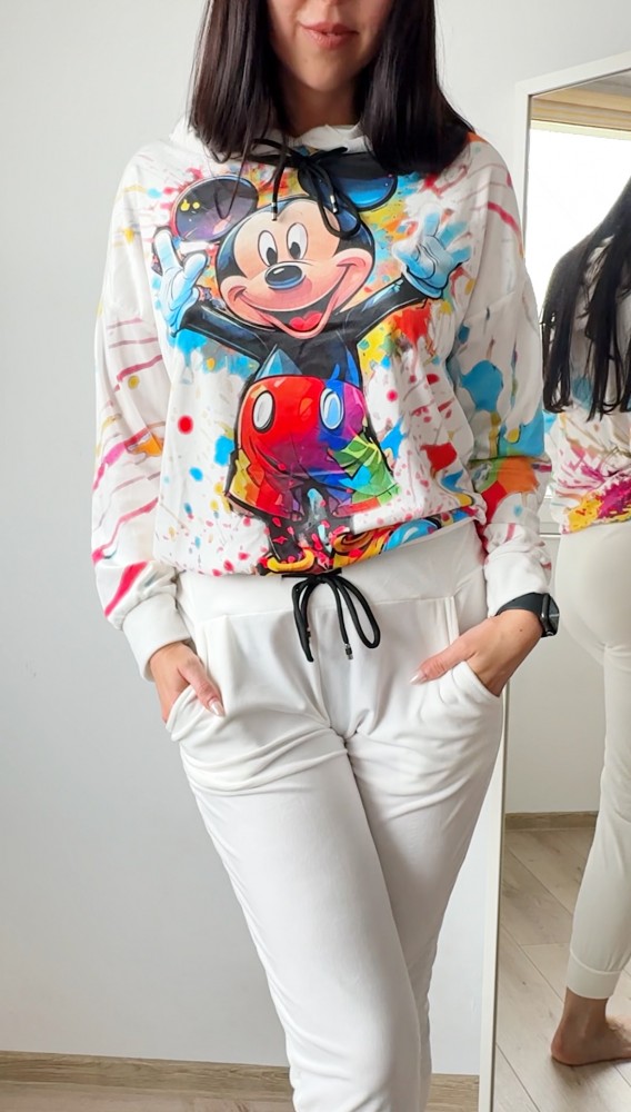 Trening dama alb din catifea cu pantaloni lungi cu snur si bluza alba cu gluga imprimeu MICKEY MOUSE happy